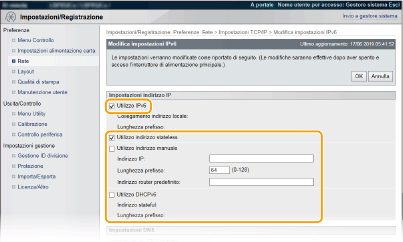 Selezionare la casella di controllo [Utilizzo IPv6] e configurare le impostazioni necessarie.
