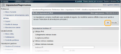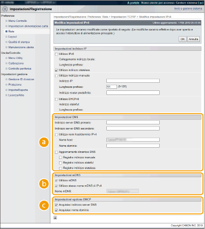 2 | Configurare le impostazioni DNS IPv6. La casella di controllo [Utilizzo IPv6] deve essere selezionata per configurare le impostazioni. Impostazione indirizzi IPv6 ![]() [Impostazioni DNS][Indirizzo server DNS primario] Digitare l'indirizzo IP di un server DNS. Non è possibile inserire un indirizzo che inizi con "ff" (o indirizzo multicast), l'indirizzo "0000::0000" (tutti zeri) o un indirizzo che inizi con "0:0:0:0:0:ffff" o "0:0:0:0:0:0". [Indirizzo server DNS secondario] Digitare l'indirizzo IP di un server DNS secondario. Non è possibile inserire un indirizzo che inizi con "ff" (o indirizzo multicast), l'indirizzo "0000::0000" (tutti zeri) o un indirizzo che inizi con "0:0:0:0:0:ffff" o "0:0:0:0:0:0". [Utilizzo nomi host/dominio IPv4] Selezionare la casella di controllo per utilizzare gli stessi nomi host e dominio utilizzati per IPv4. [Nome host] Immettere dei caratteri alfanumerici per il nome host della macchina da registrare sul server DNS. [Nome dominio] Immettere dei caratteri alfanumerici per il nome del dominio a cui appartiene la macchina, come "esempio.com". [Aggiornamento dinamico DNS] Selezionare la casella di controllo per aggiornare in modo dinamico i record DNS qualora cambi l'indirizzo IP della macchina. Per specificare i tipi di indirizzi da registrare nel server DNS, selezionare la casella di controllo per [Registra indirizzo manuale], [Registra indirizzo stateful] o [Registra indirizzo stateless]. [Impostazioni mDNS][Utilizzo mDNS] Adottato da Bonjour, mDNS (multicast DNS) è un protocollo per associare un nome host a un indirizzo IP senza utilizzare DNS. Selezionare la casella di controllo per attivare mDNS. Questa casella di controllo può essere selezionata solo quando la casella di controllo [Utilizzo IPv6] è selezionata. [Utilizzo stesso nome mDNS di IPv4] Selezionare la casella di controllo per utilizzare lo stesso nome mDNS impostato in IPv4. Per impostare un nome diverso, deselezionare la casella di controllo e immettere il nome mDNS nella casella di testo [Nome mDNS]. [Impostazioni opzione DHCP][Acquisisci indirizzo server DNS] Selezionare la casella di controllo per abilitare l'Opzione 23 e ottenere l'indirizzo del server DNS dal server DHCP. [Acquisisci nome dominio] Selezionare la casella di controllo per abilitare Opzione 24 e ottenere un nome di dominio dal server DHCP. |
