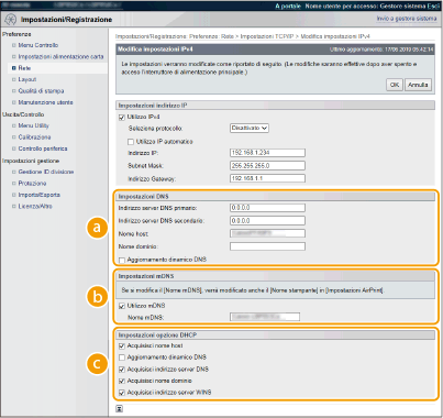 2 | Configurare le impostazioni DNS IPv4. ![]() [Impostazioni DNS][Indirizzo server DNS primario] Digitare l'indirizzo IP di un server DNS. È possibile impostare l'indirizzo IP anche dal pannello operativo (Impostazioni IPv4). [Indirizzo server DNS secondario] Digitare l'indirizzo IP di un server DNS secondario. È possibile impostare l'indirizzo IP anche dal pannello operativo (Impostazioni IPv4). [Nome host] Immettere dei caratteri alfanumerici per il nome host della macchina da registrare sul server DNS. [Nome dominio] Immettere dei caratteri alfanumerici per il nome del dominio a cui appartiene la macchina, come "esempio.com". [Aggiornamento dinamico DNS] Selezionare la casella di controllo per aggiornare dinamicamente i record DNS quando viene modificato l'indirizzo IP della macchina. [Impostazioni mDNS][Utilizzo mDNS] Adottato da Bonjour, mDNS (multicast DNS) è un protocollo per associare un nome host a un indirizzo IP senza utilizzare DNS. Selezionare la casella di controllo per abilitare mDNS e immettere il nome mDNS nella casella di testo [Nome mDNS]. Questa casella di controllo può essere selezionata solo quando la casella di controllo [Utilizzo IPv4] è selezionata. [Impostazioni opzione DHCP][Acquisisci nome host] Selezionare la casella di controllo per abilitare Opzione 12 e ottenere il nome host dal server DHCP. Per specificare se ottenere un nome host si può anche usare il pannello operativo (Impostazioni IPv4). [Aggiornamento dinamico DNS] Selezionare la casella di controllo per abilitare Opzione 81 e aggiornare dinamicamente i record DNS attraverso il server DHCP. Per specificare se eseguire l'aggiornamento dinamico DNS si può anche usare il pannello operativo (Impostazioni IPv4). [Acquisisci indirizzo server DNS] Selezionare la casella di controllo per abilitare l'Opzione 6 e ottenere l'indirizzo del server DNS dal server DHCP. [Acquisisci nome dominio] Selezionare la casella di controllo per abilitare Opzione 15 e ottenere un nome di dominio dal server DHCP. [Acquisisci indirizzo server WINS] Selezionare la casella di controllo per abilitare l'Opzione 44 e ottenere l'indirizzo del server WINS dal server DHCP. |