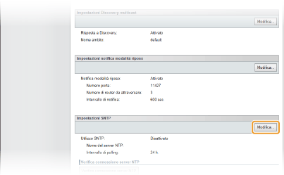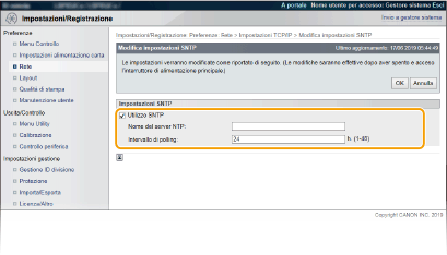Il SNTP della macchina supporta sia il server NTP (versione 3), sia il server SNTP (versioni 3 e 4). |