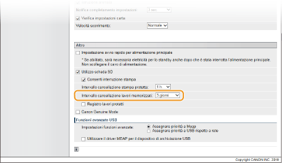 Per impostazione predefinita, i dati salvati nella scheda SD vengono cancellati automaticamente dopo un certo periodo di tempo, e non potranno più essere stampati. Per modificare il tempo di conservazione dei documenti sulla scheda SD o evitarne la cancellazione automatica, modificare le impostazioni dalla IU remota. I documenti salvati possono essere cancellati anche manualmente.