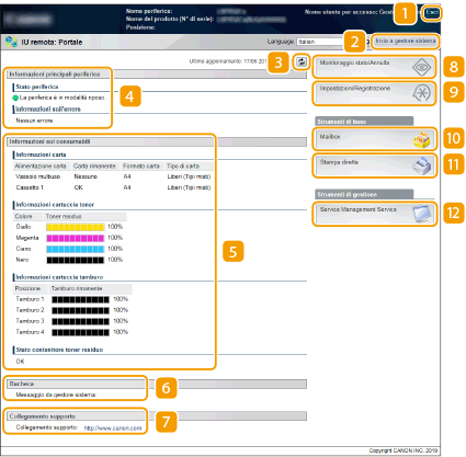 Visualizza informazioni sulla carta (quantità rimanente, formato, ecc.) e lo stato delle cartucce di toner e di altri materiali di consumo.