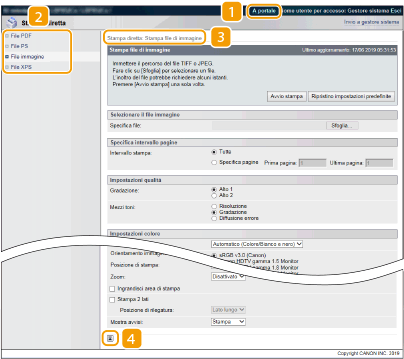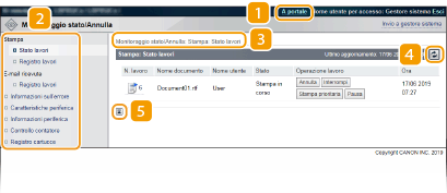 Visualizza la pagina [Monitoraggio stato/Annulla]. È possibile utilizzare questa pagina per controllare lo stato di stampa corrente, annullare l'elaborazione della stampa e visualizzare la cronologia dei lavori di stampa.