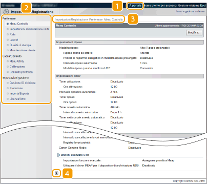 Menu nella pagina [Impostazioni/Registrazione]È possibile modificare le impostazioni nella pagina [Impostazioni/Registrazione] solo dopo aver effettuato l'accesso in Modalità gestione. Se si accede in Modalità utente generico, le opzioni [Menu Utility], [Calibrazione], [Controllo periferica], [Gestione ID divisione] e [Importa/Esporta] non vengono visualizzate. |