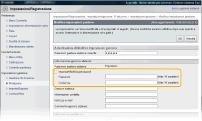 Per modificare dall'IU remota le impostazioni configurate nella macchina sono necessari i privilegi da amministratore. Seguire la procedura descritta qui sotto per modificare la password del Gestore sistema. Le impostazioni della password del Gestore sistema sono fondamentali per la sicurezza della macchina: accertarsi quindi che tale password sia nota solo agli Amministratori.