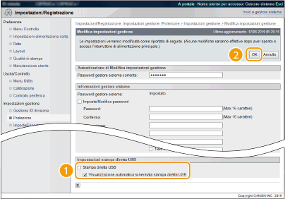 Deselezionare la casella di controllo per disabilitare la stampa diretta da un dispositivo di memoria USB. Selezionare la casella di controllo per abilitare la stampa da un dispositivo di memoria USB. Selezionando anche la casella di controllo [Visualizzazione automatica schermata stampa diretta USB], quando un dispositivo di memoria USB verrà collegato alla macchina verrà automaticamente visualizzata la schermata USB Direct Print.