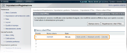 Abilitazione della comunicazione IPSec). Un criterio di sicurezza è costituito dai gruppi di impostazioni descritti di seguito. È possibile registrare più criteri in base a una combinazione di indirizzo IP e numero di porta. Dopo la registrazione dei criteri, specificare l'ordine con cui devono essere applicati.
