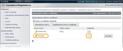 Una coppia di chiavi non può essere eliminata se viene attualmente utilizzata per un determinato scopo, ad esempio quando "TLS" o "IEEE 802.1X" sono visualizzati in [Utilizzo chiave]. In questo caso, disabilitare la funzione o sostituire la coppia di chiavi prima dell'eliminazione.