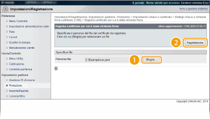 Fare clic su [Sfoglia] in [Percorso file], specificare il file per la richiesta di firma certificato e fare clic su [Registrazione].