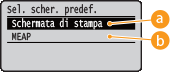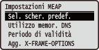 ![]() | Le impostazioni relative alla schermata principale di MEAP vengono elencate con brevi descrizioni. Le impostazioni predefinite sono contrassegnate con una croce ( ). |