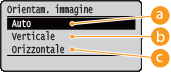 Se l'impostazione specificata (<Verticale> o <Orizzontale>) non corrisponde all'orientamento dell'immagine, l'immagine viene stampata con dimensioni ridotte. |