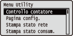 | È possibile visualizzare il numero totale di pagine stampate e stampare informazioni di sistema interne. Quando si preme  (  ) sul pannello operativo, viene visualizzato il menu Utility. È possibile specificare le impostazioni descritte qui sotto quando la macchina è offline. |