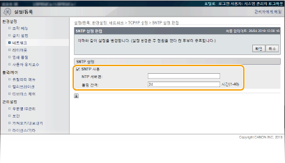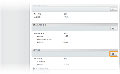 ![]() | SNTP(Simple Network Time Protocol)로, 네트워크의 시간 서버를 사용하여 시스템 시계를 조정할 수 있습니다. SNTP를 사용하는 경우, 시스템 시계가 항상 정확하도록 시스템이 주기적으로 시간 서버를 확인합니다. |