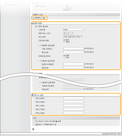 SNMP(Simple Network Management Protocol)는 MIB(Management Information Base)를 사용하여 네트워크의 통신 장치를 모니터링하고 제어하기 위한 프로토콜입니다. 본 기기는 SNMPv1 및 보안 기능이 개선된 SNMPv3을 지원합니다. 문서를 인쇄하거나 리모트 UI를 사용할 때 컴퓨터에서 기기의 상태를 확인할 수 있습니다. SNMPv1 또는 SNMPv3를 각각 또는 동시에 모두 활성화할 수 있습니다. 네트워크 환경과 사용 목적에 맞게 각 버전의 설정을 지정합니다.