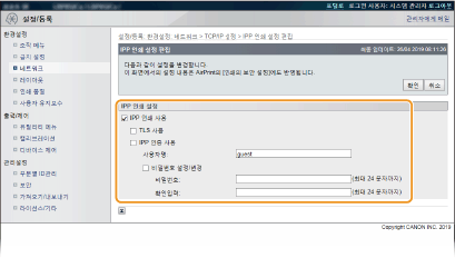 2 | 필요에 따라 설정을 구성합니다. ![]() [IPP 인쇄 사용] 인쇄에 IPP/IPPS를 사용하는 경우, 확인란을 선택합니다. 사용하지 않는 경우에는 확인란 선택을 해제합니다. [TLS 사용] IPPS(TLS 암호화 통신을 이용한 IPP 인쇄)를 사용하는 경우, 확인란을 선택합니다. 사용하지 않는 경우에는 확인란 선택을 해제합니다. ![]() IPPS를 사용하는 경우 TLS 암호화 통신 기능을 활성화합니다. 암호화 통신에 TLS 사용하기 ![]() 네트워크 통신에 사용할 키를 생성할 때 [키 알고리즘]에서 [RSA]를 선택하는 경우, [1024-bit] 이상의 키 길이를 설정하십시오. [512-bit]의 키 길이를 설정하면 사용 중인 운영 체제에 따라 IPPS 인쇄를 올바르게 수행하지 못할 수 있습니다. [IPP 인증 사용] IPP 인쇄에 사용자 인증 기능을 사용하는 경우, 확인란을 선택하고 사용자 이름 및 비밀번호를 설정합니다. 사용하지 않는 경우에는 확인란 선택을 해제합니다. [사용자명] IPP 인증에 사용되는 사용자 이름을 영숫자로 입력합니다. [비밀번호 설정/변경] 비밀번호를 설정하거나 변경하려면 확인란을 선택하고 [비밀번호] 텍스트 상자에 비밀번호를 영숫자로 입력합니다. 확인을 위해 [확인입력] 텍스트 상자에 동일한 비밀번호를 입력합니다. |