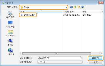 4 | 추가 드라이버가 들어있는 폴더를 지정하고, INF 파일을 선택한 후 [열기]를 클릭합니다. ![]() 인쇄 서버의 운영 체제에 따라 아래와 같이 폴더를 선택합니다. 인쇄 서버에서 32비트 운영 체제가 실행되는 경우 사용자 소프트웨어 CD-ROM/DVD-ROM에서 [UFR II]-사용자 언어-[x64]-[Driver] 폴더를 선택합니다. 인쇄 서버가 64비트 운영 체제를 사용하는 경우 사용자 소프트웨어 CD-ROM/DVD-ROM에서 [UFR II]-사용자 언어-[32BIT]-[Driver] 폴더를 선택합니다. | ||||||