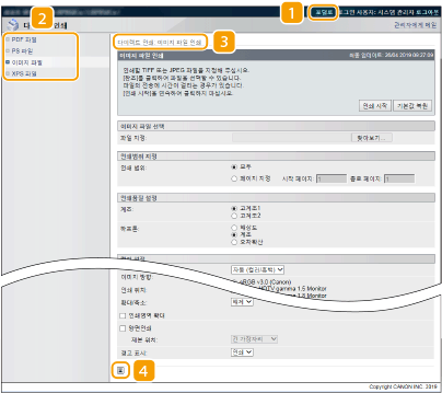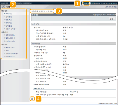 [설정/등록] 페이지의 메뉴관리자 모드로 로그온한 경우에만 [설정/등록] 페이지의 설정을 변경할 수 있습니다. 일반 사용자 모드로 로그온한 경우 [유틸리티 메뉴], [캘리브레이션], [디바이스 제어], [부문별 ID관리] 및 [가져오기/내보내기]가 표시되지 않습니다. |