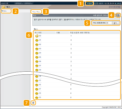 상자 목록을 표시합니다. 상자를 열어 상자에 저장된 문서의 세부 정보를 확인할수 있으며, 문서를 인쇄 및 삭제할 수 있습니다.