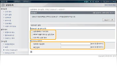 포털 페이지의 [설정/등록]에서 설정할 수 있는 항목의 설정 데이터를 내보내려면 이 확인란을 선택하십시오.
