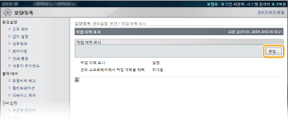 확인란을 선택하면 iW Management Console 같은 장치 관리 소프트웨어를 사용하여 인쇄 작업 내역을 얻을 수 있습니다. 인쇄 작업 내역을 얻기 위해 관리 소프트웨어를 비활성화하려면 확인란의 선택을 해제합니다. 이 기능은 [작업 이력 표시] 확인란이 선택된 경우 자동으로 활성화됩니다.