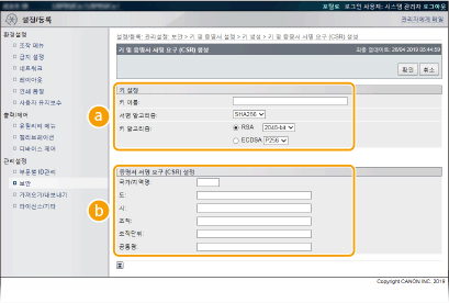 TLS(Transport Layer Security)를 통한 암호화된 통신에 키 쌍이 필요한 경우, 이를 기기에서 생성할 수 있습니다. 리모트 UI를 통해 기기에 액세스하거나 IPP 인쇄를 수행할 때 TLS를 사용할 수 있습니다. 사전 설치된 쌍을 비롯하여 최대 8개까지 키 쌍을 등록할 수 있습니다. 자가 서명 인증서가 "네트워크 통신"에서 생성된 키 쌍과 함께 사용됩니다. "키 및 인증서 서명 요구(CSR)"를 사용하여 기기에 의해 생성된 키 쌍에 대한 CA 발급 디지털 인증서를 신청할 수 있습니다.