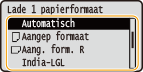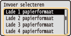 om een keuze te maken uit <Lade 1 papierformaat> t/m <Lade 5 papierformaat>, en druk op