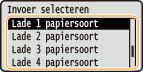 Maak een keuze uit <Lade 1 papiersoort> t/m <Lade 5 papiersoort>, en druk op