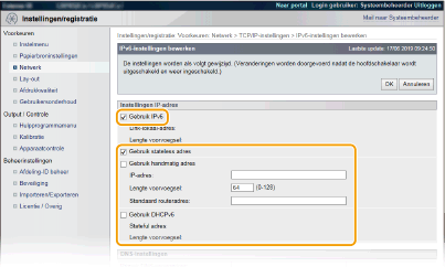 Controleren of de instellingen juist zijnControleer of het scherm UI op afstand kan worden weergegeven op uw computer door het IPv6-adres van het apparaat te gebruiken. De UI op afstand starten Instellingen selecteren vanaf het bedieningspaneelTevens kunt u IPv6-adressen in- of uitschakelen in het instellingenmenu van het bedieningspaneel. IPv6-instellingen Als u het IP-adres hebt gewijzigd na de installatie van het printerstuurprogrammaU moet de te gebruiken poort nogmaals specificeren. Voor de procedure om een andere poort te kiezen, raadpleegt u de handleidingen voor de relevante stuurprogramma´s op de website voor de handleidingen. |