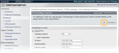 2 | Configureer de DNS-instellingen van IPv4. ![]() [DNS-instellingen][Primair DNS-serveradres] Voer het IP-adres van een DNS-server in. U kunt het IP-adres ook instellen vanaf het bedieningspaneel (IPv4-instellingen). [Secundaire DNS-serveradres] Voer het IP-adres van een eventuele secundaire DNS-server in. U kunt het IP-adres ook instellen vanaf het bedieningspaneel (IPv4-instellingen). [Hostnaam] Typ hier alfanumerieke tekens voor de hostnaam van het apparaat dat u wilt registreren op de DNS-server. [Domeinnaam] Typ hier alfanumerieke tekens voor de naam van het domein waarvan het apparaat deel uitmaakt, zoals ‘voorbeeld.com’. [DNS Dynamic Update] Schakel dit selectievakje in om de DNS-records dynamisch bij te werken wanneer het IP-adres van het apparaat verandert. [mDNS-instellingen][Gebruik mDNS] mDNS (multicast DNS) wordt ondersteund door Bonjour en is een protocol voor het koppelen van een hostnaam aan een IP-adres zonder DNS te gebruiken. Activeer het selectievakje om mDNS in te schakelen en geef de mDNS-naam op in het tekstvak [mDNS-naam]. Dit selectievakje kan alleen worden geactiveerd als het selectievakje [Gebruik IPv4] ook geactiveerd is. [Instellingen DHCP-opties][Hostnaam verkrijgen] Schakel dit selectievakje in om Optie 12 in te schakelen en de hostnaam te verkrijgen van de DHCP-server. U kunt ook opgeven of een hostnaam van het bedieningspaneel moet worden ontvangen (IPv4-instellingen). [DNS Dynamic Update] Schakel dit selectievakje in om Optie 81 in te schakelen om de DNS records dynamisch te actualiseren via de DHCP-server. U kunt ook opgeven of u een dynamische DNS actualisering vanaf het bedieningspaneel wilt realiseren (IPv4-instellingen). [DNS-serveradres verkrijgen] Schakel dit selectievakje in als u Optie 6 wilt inschakelen en een DNS-server wilt ophalen van de DHCP-server. [Domeinnaam verkrijgen] Schakel dit selectievakje in als u Optie 15 wilt inschakelen en de domeinnaam wilt ophalen van te verkrijgen van de DHCP-server. [WINS-serveradres verkrijgen] Schakel dit selectievakje in als u Optie 44 wilt inschakelen en een WINS-serveradres wilt ophalen van de DHCP-server. |