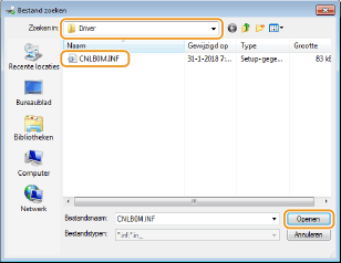 4 | Geef de map op waar de extra stuurprogramma's zijn opgeslagen, selecteer het INF-bestand en klik op [Openen]. ![]() Selecteer de map op zoals hieronder weergegeven, in overeenstemming met het besturingssysteem van de printserver. Als de printserver een 32-bits besturingssysteem heeft Selecteer de map [UFR II]-uw taal-[x64]-[Driver] op de CD-ROM/DVD-ROM met gebruikerssoftware. Als de printserver een 64-bits besturingssysteem heeft Selecteer de map [UFR II]-uw taal-[32BIT]-[Driver] op de CD-ROM/DVD-ROM met gebruikerssoftware. | ||||||