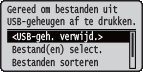 Als u <Bestanden sorteren> op het scherm in stap 1 selecteert, kunt u de weergavevolgorde van de bestanden veranderen wanneer u het af te drukken bestand selecteert. |