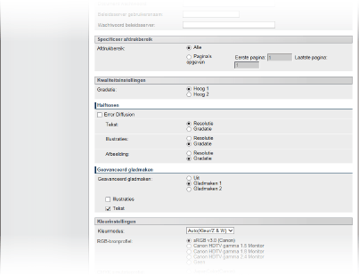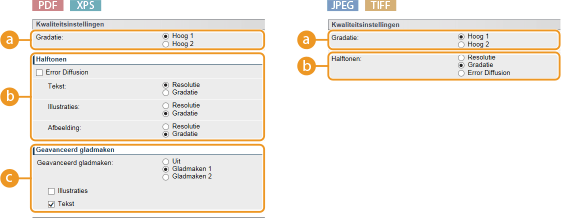 [Halftonen] [Error Diffusion] | Als u dit selectievakje activeert, kunt u een modus gebruiken die geschikt is voor het afdrukken van gegevens met tekst en dunne lijnen, de gebogen lijnen van CAD-gegevens, enzovoort. Dit geldt voor alle typen beeldbestanden en daarom kunt u [Resolutie] of [Gradatie] niet selecteren. ![]() De stevigheid van de textuur en hechtende toner kan afnemen als u [Error Diffusion] gebruikt. |