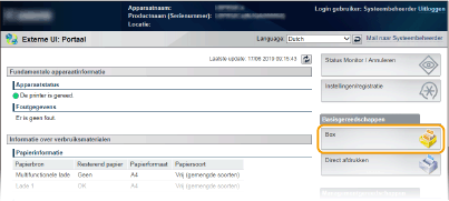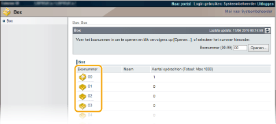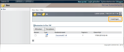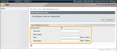 U kunt een naam voor een vak instellen en een pincode op het vak te openen. Als u een vriendelijke naam voor het vak instelt, kunt u het vak gemakkelijk herkennen als u met behulp van het printerstuurprogramma de plaats selecteert waar u de documenten wilt opslaan. Als u een pincode instelt, kunnen de opgeslagen documenten uitsluitend worden geopend door een beperkt aantal gebruikers, hetgeen de veiligheid verhoogt.