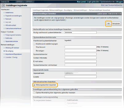 Ook als de afdrukbewerkingen zijn beperkt, kunnen instellingslijsten en -rapporten worden afgedrukt. Rapporten en lijsten afdrukken |