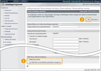 Deactiveer dit selectievakje om direct afdrukken vanuit een USB-geheugentoestel uit te schakelen. Activeer dit selectievakje om direct afdrukken vanuit een USB-geheugentoestel in te schakelen. Als u ook het selectievakje [USB Direct schermafdruk automatisch weergeven] activeert, verschijnt automatisch het scherm USB Direct Print als een USB-geheugentoestel op het apparaat wordt aangesloten.