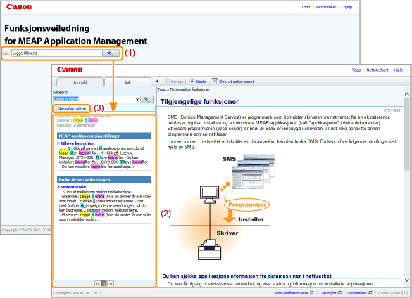 Ved å skrive inn en tegnstreng i [Søk] på øverste side eller i tekstboksen [Søkeord] i søkepanelet og deretter klikke [