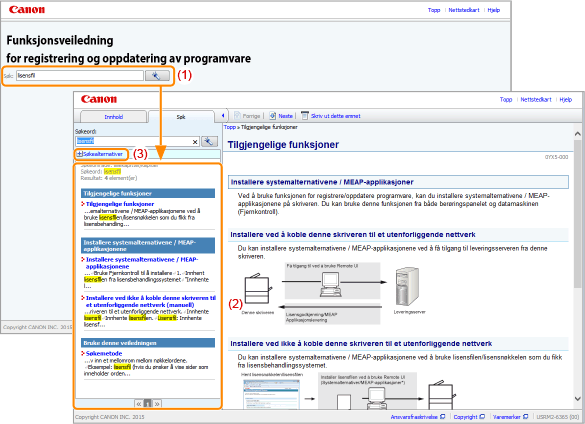 Ved å skrive inn en tegnstreng i [Søk] på øverste side eller i tekstboksen [Søkeord] i søkepanelet og deretter klikke [