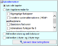 ![]() Søkealternativene kan brukes for å spesifisere hvilket kapittel du vil søke i, skille mellom store og små bokstaver, og hvorvidt det skal skilles mellom tegn med en og to byte.