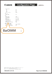 Skriv ut Konfigureringsside, og sjekk at "BarDIMM" viser i "PCL" Hvis "BarDIMM" viser, er ROM korrekt installert. ![]() Hvis "BarDIMM" ikke vises ROM er ikke riktig installert. Fjern ROM fra maskinen og koble den til igjen. | ![]() |