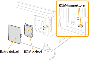Denne delen beskriver hvordan du installerer den valgfrie ROM-en i maskinen. ROM-en brukes til å koble til ROM-kontakter inne i baksiden på maskinen. Les forholdsreglene i Installasjon før installering av ROM-en. | ![]() |