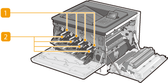 Sett tonerkassettene i åpningene med riktig farge: Y (gul) i åpningen lengst til venstre, etterfulgt av M (magenta), C (cyan) og K (svart).