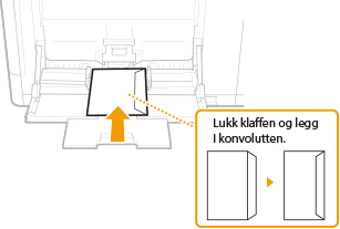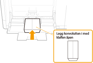Legg i konvolutter i stående retning (med den korte kanten mot maskinen) med forsiden (siden uten limkant) vendt ned. Du kan ikke skrive ut på baksiden av konvolutter.