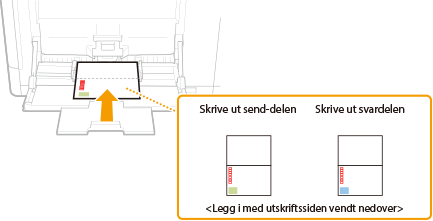 Før du legger i konvolutter eller postkort, må du forberede dem ved å glatte ut eventuelle bretter på dem. Vær også oppmerksom på formatet for konvoluttene eller postkortene, og hvilken side som ligger vendt oppover. Vær klar over at verken konvolutter eller postkort kan legges i papirskuffen.