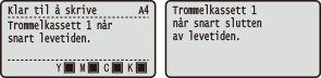 Denne meldingen varsler deg om at en trommelkassett for den fargen som oppgis snart må byttes. Sørg for at du har en ny trommelkassett klar. Bytt trommelkassetten hvis denne meldingen vises før du skal skrive ut en stor jobb.