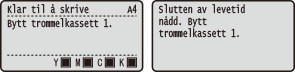 Når meldingen <Slutten av levetid nådd. Bytt trommelkassett N.> vises, stanses utskriften midlertidig. Du gjenopptar utskriften ved å trykke på  (  ). |