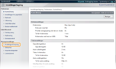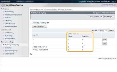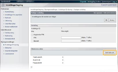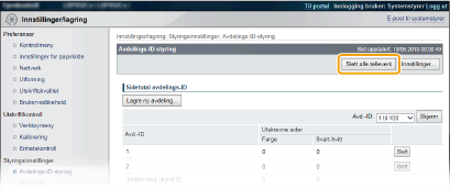 For å skrive ut kontrollresultatetFor å tilbakestille sideantallet til nullNår du ønsker å tilbakestille sideantallet til null for hver avdeling, klikker du på tekstkoblingen under [Avd.-ID] og klikker på [Slett telleverk]  [OK]. Hvis du ønsker å tilbakestille alle antallene for hver avdeling til null, klikker du på [Slett alle telleverk]  [OK]. |