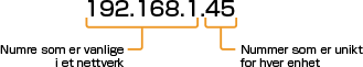 En IP-adresse bestpr av fire tall med et skilletegn (punktum) (eksempel: 192.168.1.45). Hvert tall må være innenfor området på 0 til 255. de første tre numrene skal vanligvis være de samme som de for ruteren fordi de er felles for nettverket. Avgjør det siste nummeret (f.eks. 45 i 192.168.1.45) som er ulik det som er for andre enheter.