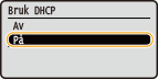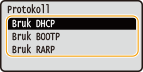 3 | Velg <Bruk DHCP>, <Bruk BOOTP> eller <Bruk RARP>, og trykk på . Du kan bare bruke én av protokollene DHCP, BOOTP og RARP. Hvis den valgte protokollen er stilt til <På>, blir de andre to protokollene automatisk stilt til <Av>. |