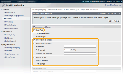 Merk av for [Bruk IPv6], og konfigurer de nødvendige innstillingene.