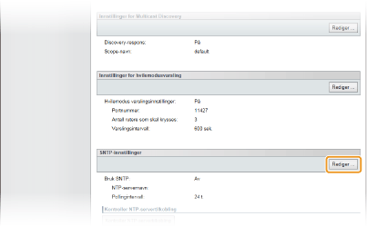 ![]() | Simple Network Time Protocol (SNTP) gjør at du kan justere systemklokken ved å bruke samme tidsserver på nettverket. Når du bruker SNTP, kontrollerer systemet tidsserveren regelmessig, slik at systemklokken alltid er oppdatert. |